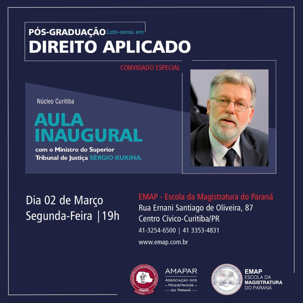 Nesta segunda-feira (2/3), às 19h, o Ministro Sérgio Kukina, do Superior Tribunal de Justiça (STJ), estará em Curitiba para proferir uma aula inaugural aos alunos do curso de pós-graduação da Escola da Magistratura do Paraná (EMAP). O evento será realizado no auditório da EMAP, localizado na Rua Ernani Santiago de Oliveira, 87. Acesse a transmissão ao vivo. FAÇA SUA INSCRIÇÃO NO CURSO DE PÓS-GRADUAÇÃO (últimas vagas)